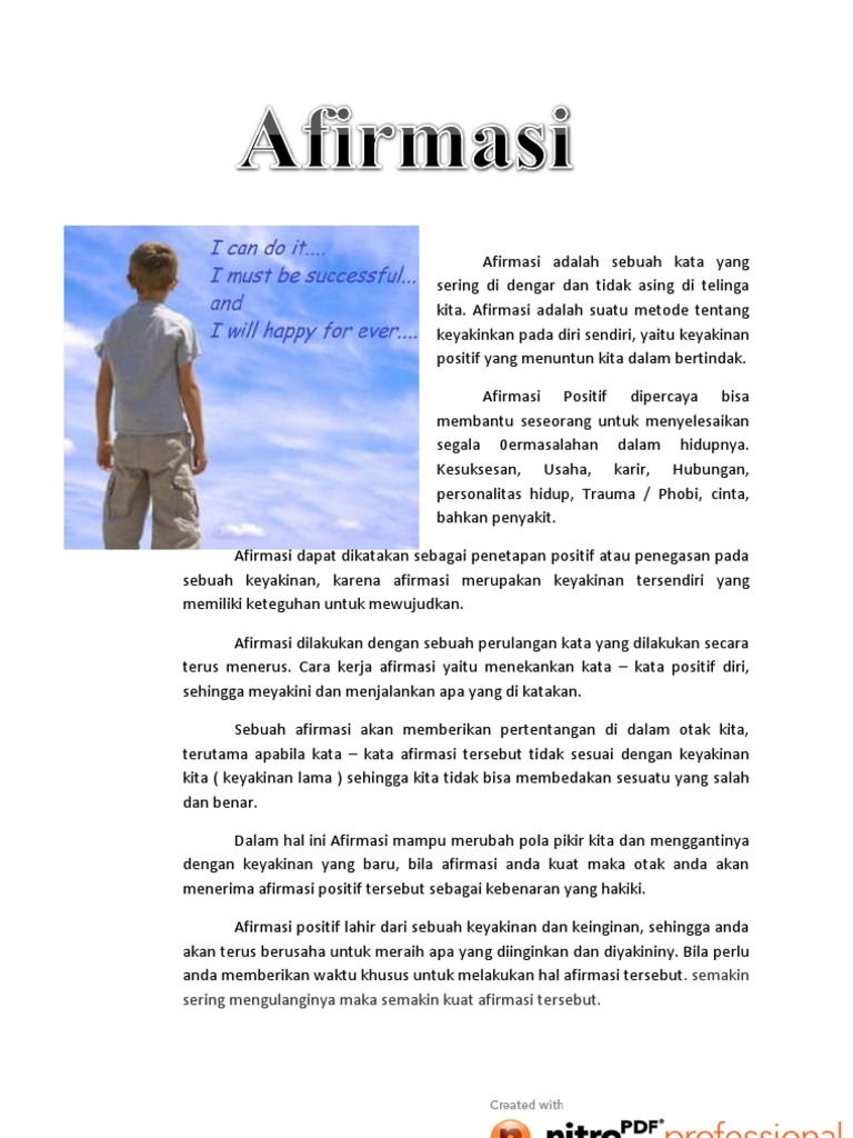 Afirmasi adalah pernyataan-pernyataan positif dan spesifik yang ditujukan kepada diri sendiri. Untuk itu afirmasi dapat digunakan sebagai salah satu solusi untuk menghadapi kerasnya kehidupan. Tingkat kepercayaan diri juga dipengaruhi oleh kata-kata apa yang kita ucapkan setiap harinya.